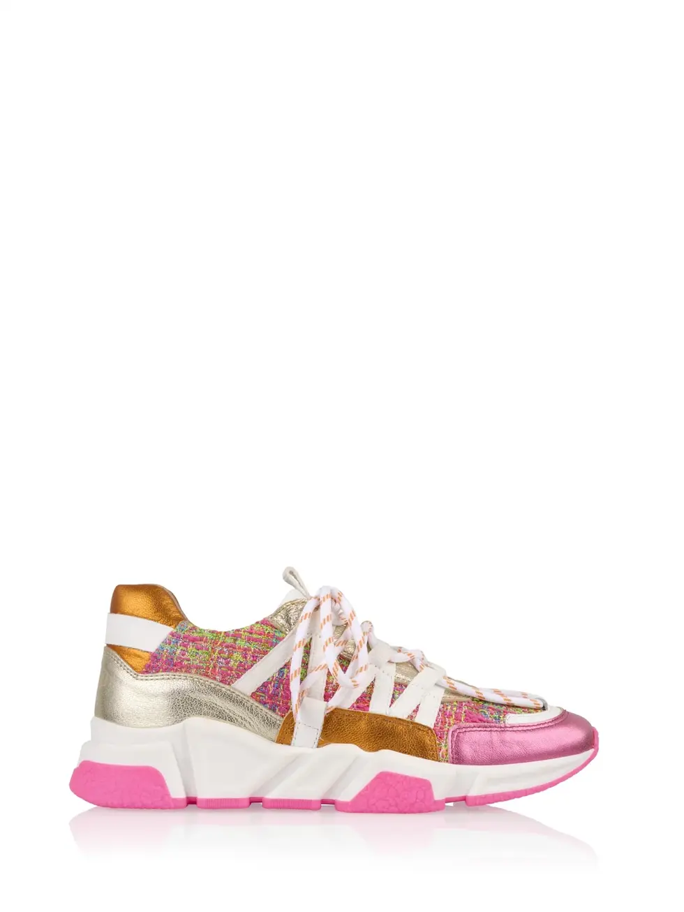 Deze sneakers zijn net wat meer speciaal door de veter die over de neus loopt. Voor de dames met oog voor detail. We love it! Deze sneaker is aan de buitenzijde van leer & tweed stof en aan de binnenzijde volledig van leer. Doe mee met de LOS ANGELES trend!