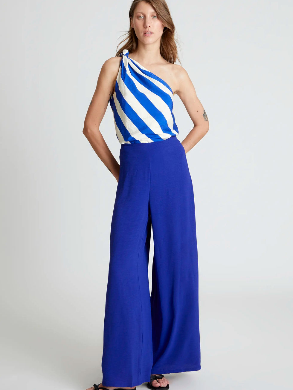 Long trousers in lightweight blue crepe fabric. Featuring a mid-rise, fixed waist and a wide leg. Concealed side zip closure.